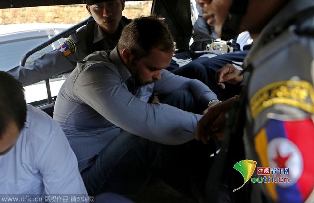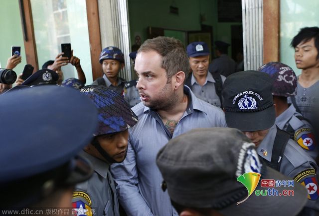 当地时间2014年12月18日,缅甸仰光,新西兰籍公民Philip Blackwood在警察的护送下,走进法庭出席听证会。这名新西兰男子在一家名为V Gastro的缅甸酒吧工作,此前这家酒吧在Facebook上贴出了一张宣传海报,内容含一尊佛像戴着DJ耳机的画面,在缅甸这样一个佛教国家,这张海报立刻引发轩然大波。据悉,虽然海报是在酒吧开业前三周贴出,而且在Facebook上也进行了“秒删”,之后还在Facebook道歉,但为时已晚,当地网友纷纷愤怒留言。周三晚,在接到缅甸宗教事务部一位官员的投诉之后,当地警方分别逮捕了该酒吧40岁的老板Tun Thurein、32岁的酒吧总经理、新西兰人Philip Blackwood和26岁的经理Htut Ko Ko Lwin,并且勒令其停业。仰光法院方面称,根据宗教法案,他们将遭到两项罪名的指控,任何试图侮辱、破坏或损坏宗教的行为,最高将遭受两年的监禁惩罚,并且不得保释。