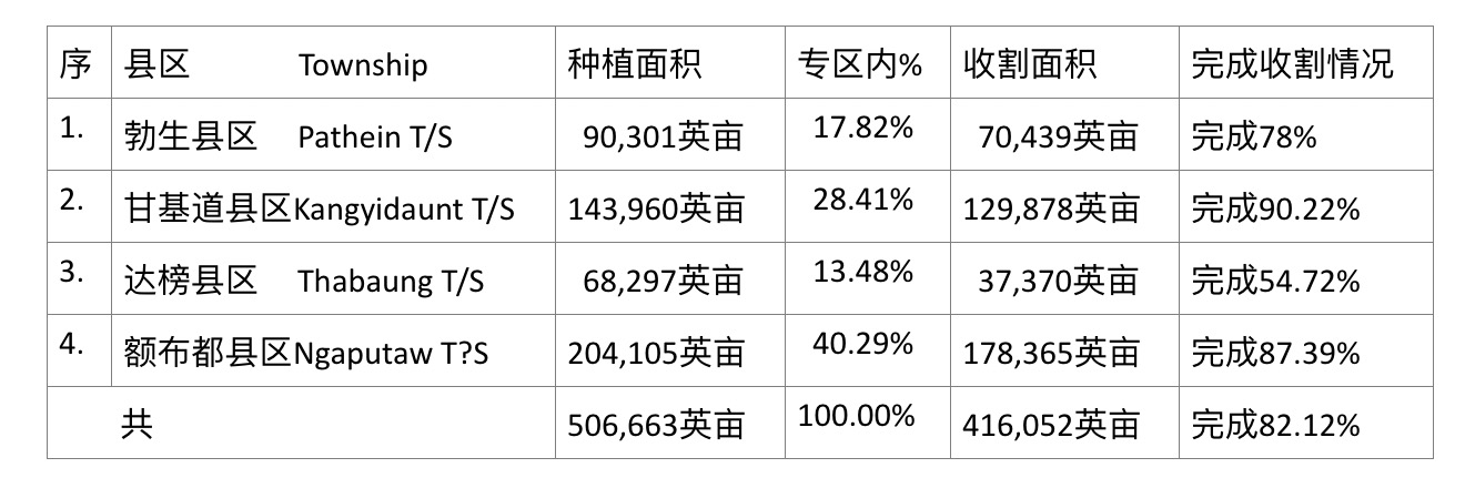 现财年勃生专区内各县区种植的雨季稻及目前完成收割工作的农田面积如下: