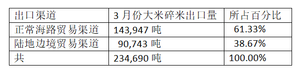 3月份期间由海路及边贸渠道出口的数量分别如下: