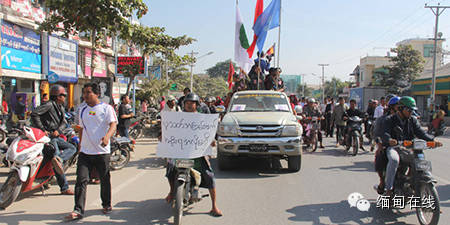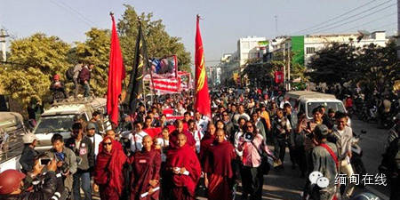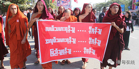 此次游行示威活动,包括曼德勒僧人、政治团体、学生和当地百姓在内的1000多人进行的游行。
