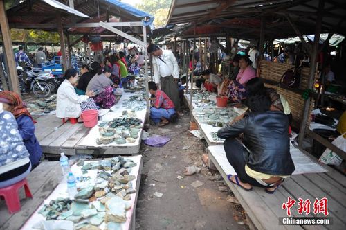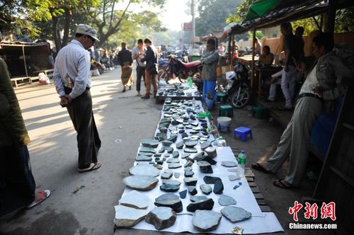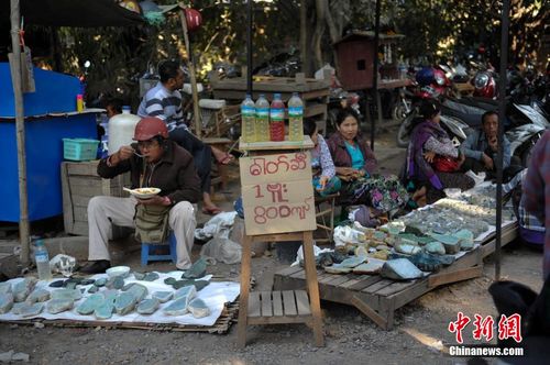 曼德勒的玉石市场位于市区西南方,是缅甸国内规模最大的玉石市场,众多商人带着翡翠毛料和成品在此交易。市场玉石的交易如同菜市场买菜,所以也吸引着不少游客到这里看热闹,感受玉石王国的独特文化。图为1月6日摆出的毛料供顾客挑选。 中新社发 刘冉阳 摄