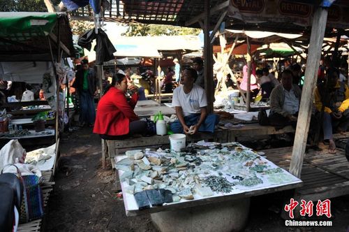 曼德勒的玉石市场位于市区西南方,是缅甸国内规模最大的玉石市场,众多商人带着翡翠毛料和成品在此交易。市场玉石的交易如同菜市场买菜,所以也吸引着不少游客到这里看热闹,感受玉石王国的独特文化。图为1月6日玉石市场一角。 中新社发 刘冉阳 摄