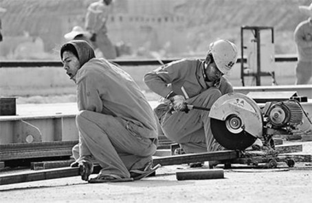 莱比塘铜矿为当地人提供了大量就业机会。图为工人们正在切割钢材。