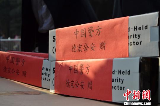 中新网瑞丽2月9日电(马航可)9日,中国德宏警方向缅甸掸邦警方赠送禁毒反恐装备仪式在云南瑞丽姐告国门广场举行。中方代表德宏州州公安局局长马闻、缅方代表掸邦警察厅副厅长傲缅莫等一行人参加了赠送仪式。