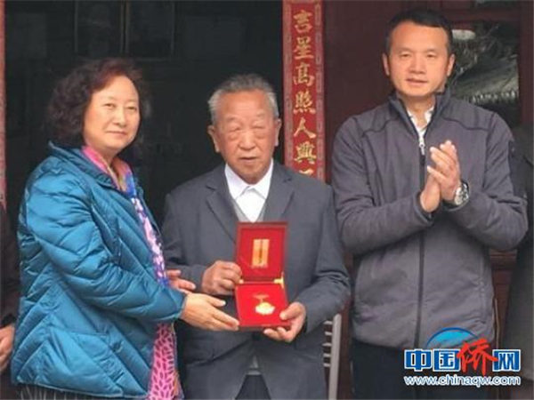 图为梁有成获颁中国人民抗日战争胜利70周年纪念章 钟欣 摄