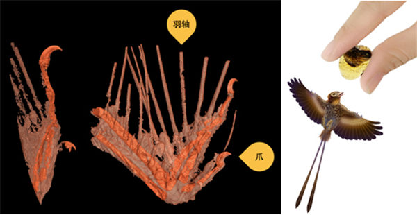 果不其然,“天使之翼”经过MicroCT扫描后确定是中生代的古鸟,它是世界上最小的恐龙,体长仅有3.5厘米,属于反鸟类。同时,邢立达在琥珀的珀体内发现有挣扎的痕迹,从而确定这只古鸟是在死前被树脂包裹住的。