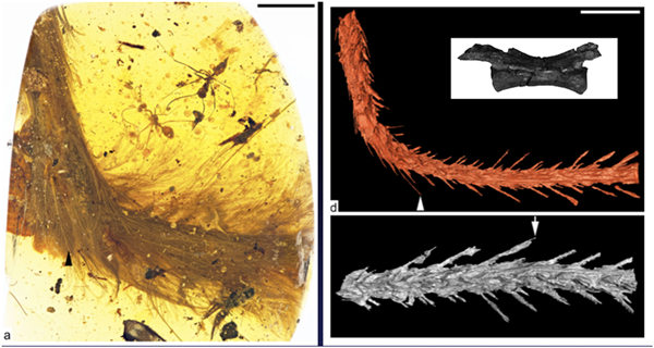 这天,邢立达如往常一样逛“琥珀摊子“,一枚看似土鸡蛋被商贩称之为”蚂蚁上树”的琥珀吸引了他的注意。“植物怎么可能会有羽枝,显然是羽毛。而这个条形物只可能是鸟类,或是恐龙的尾巴,”他说,当下他就意识到,这颗“土鸡蛋”很可能会是人类第一次看到恐龙的琥珀。经过几番讨价还价,邢立达很便宜地买下了这枚琥珀。经过同步辐射扫描,显然是一只恐龙的尾巴,它有八节椎体。这次的发现,让很多人开始接受恐龙有毛这件事。
