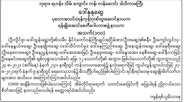 在最近几天的《缅甸之光》报、《镜报》的广告栏中,见到了悼念“民主”时代吴巴瑞(U Ba Sway)总理夫人Daw Nu Nu Sway逝世的广告。老人家逝世时已有百岁高龄,“这可能是他们那个时代的最后一名硕果仅存的代表人物了。”有人就这样说道。