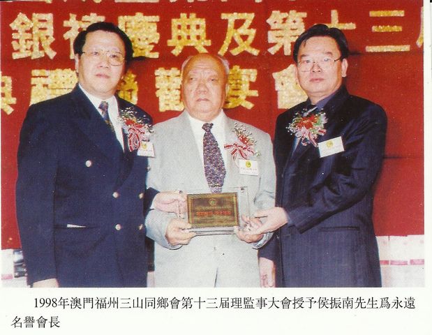 侯先生到了澳门后,即和缅甸同侨聚首筹建福州三山同乡会,还当了澳门许多社团的重要职位,他爱家乡、爱父老乡亲,于八十年代首先提议并带头建起了青州桥,于九十年代独资捐建了下州村主干道水泥路。还捐建了下州村水搭,方便乡亲们饮水,他热爱公益事业,造福家乡的乡亲们,留芳百世。