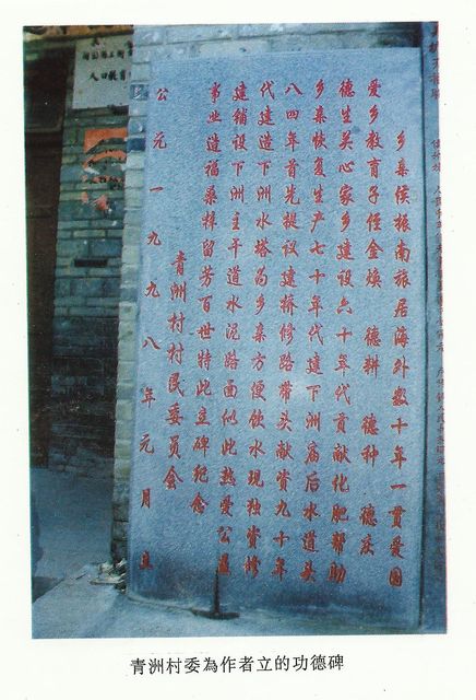 一九九八年,侯先生回国参加水泥公路竣工典礼,热情的乡亲们夹道欢迎,披红挂彩,敲锣打鼓,放鞭炮……,青州村村民委会还为他竖立了石碑作永久的纪念。侯先生他这一生过得很有意义,无怨无悔。他也把这些丰功伟迹的录像寄到缅甸让我分享。