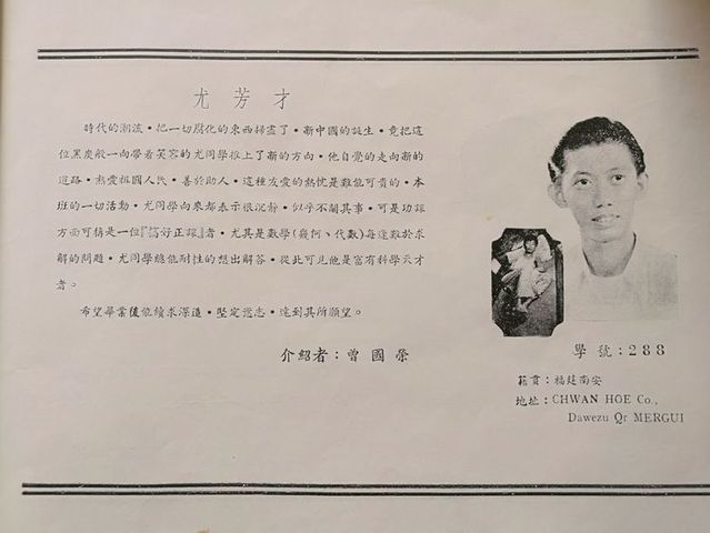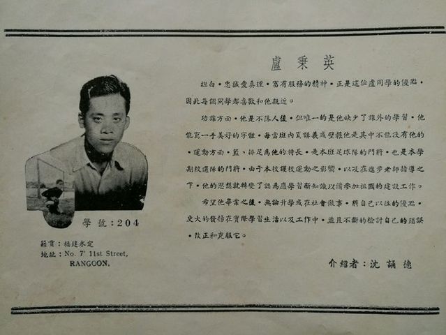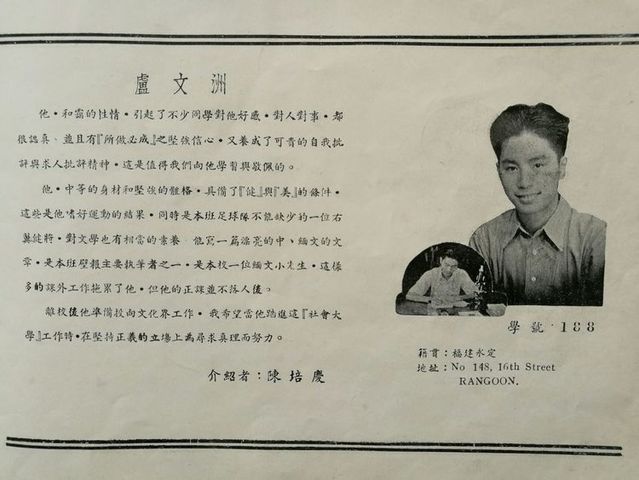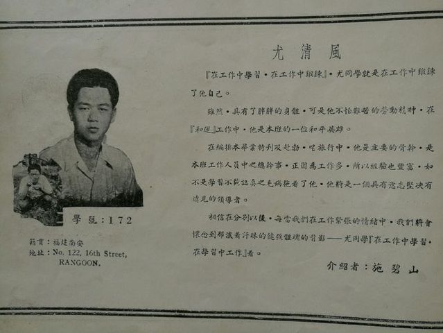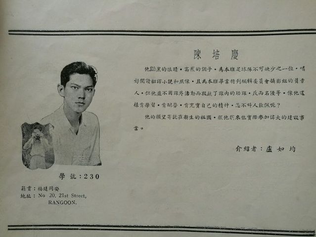 我们与爱护我们的老师,同学以及热心教育的侨胞们一样,期望这毕业特刋,能比前几届毕业刋更精彩地刋印出来。我们很早就组织一个特刋编辑委员会,计划如何编印的诸问题。先后发动同学们到各商号去招广告及写文章。在热心侨教的先生们的大力赞助下,我们得以克服经济困难的大问题,鼓舞并增强我们尽快编好特刋的信心。但是,在编辑过程中,我们遇到了许多意外挫折。负责编辑的同学们,在毕业之后分散各处,有回国升学的,有回山芭的;也有转入英文学校的,仍留校升学的祇有几位。原先负责编辑工作的同学,也因自身工作繁忙,无法将工作完整地移交给继续升学的同学。因此,许多工作曾停滞相当长的时间。后来,在爱护,赞助我们的老师与同学们的鼓励下我们怀着急虑的心情,又推举几位同学来完成后半段的工作。在毕业后五个月的今天,我们总算把这不三不四的小册子捧出来和大家见面了。这是我们初次尝试,毫无工作经验,所以在收集数据,编排和校对上,一定会有许多不妥当的缺点。于此,我们衷心地希望缅华文教界的先辈们和本校老师,同学们能予多多批评与指教。最后,我们向关心我们的老师,同学们,以及惠登广告的各商家,深致谢意!