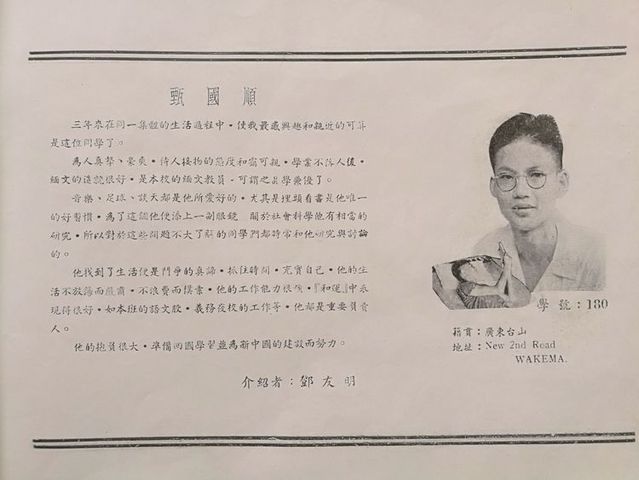 今天,我们在这班已经三年了,她在华中这民主摇篮里,曾留下了许多不平凡的成绩。现在就让我们 略述一下本班三年来的生活与学习的情况吧! 在二年半前(初一上)时我们还分成甲,乙班。甲组约四十余人,乙组卅人左右 。刚刚踏入民主摇篮的我们 ,在自已的思想和作风上还是很保守的。华中的民主活动颇使我们感到惊异与新奇。尤其是部份从国内蒋管区来的同学们,起初是儍头儍脑的样样都很畏缩。有着国民党反动派所给予的奴才思想。就在这新旧思想斗争的时候,[护校运动]产生了。我们大家都诧异着为什么学生可以反对校方呢? 可是,𣎴久我们明白后,我们的勇气也大大的被鼓舞起来,往日的畏惧也渐渐消失了。有一次全体师生开过一次群众大会,我们被感动得流下愤怒的眼泪,我们的思想从这个时候开始转变了。因此,[护校运动]可说是我们新旧思想的分界线,新民主思想战胜了落后的思想。……