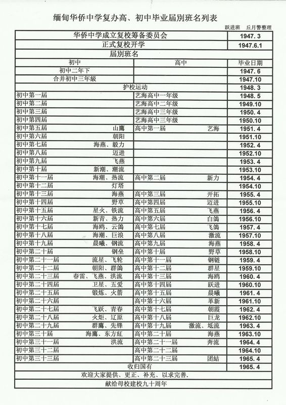 缅甸华侨中学复办高、初中毕业届别、班名列表(跃进班 丘月警整理)