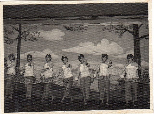 现在提供两张四十四年前我们伊江合唱团演出“织网姑娘”的照片让大家分享,两张照相里站在左边第一位的就是我本人。