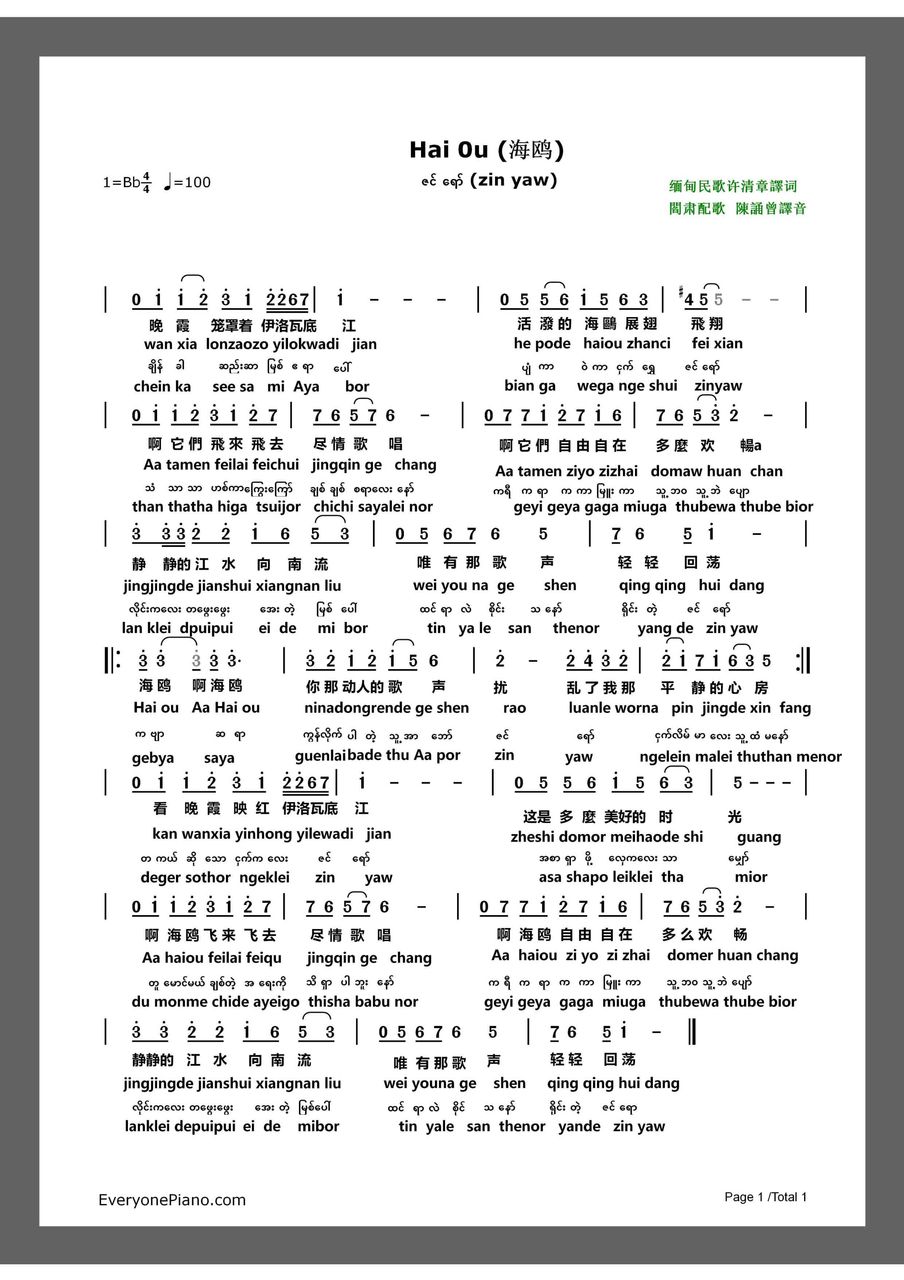 编者按:为了让不懂缅文或不懂中文的人学唱缅甸歌曲,陈诵曾先生为缅甸著名歌曲《海鸥》的缅甸原版和中文版做了译音,共三个版本,第一个版本适合不懂缅文的中国人学唱缅文原版《海鸥》;第二个版本适合不懂中文的缅甸人学唱中文版的《海鸥》;第三个版本是将以上两个版本合在一起。