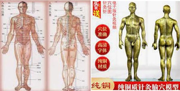 左:中医发明人体穴位图 右:中医铸造人体穴位铜人