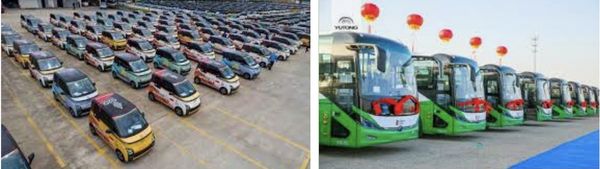 左:印尼G20峰会中国电动小汽车, 右:卡塔尔世足杯中国电动大巴士