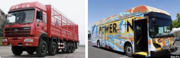 左:中国重型货车出口全球, 右:中国电动大巴出口全球