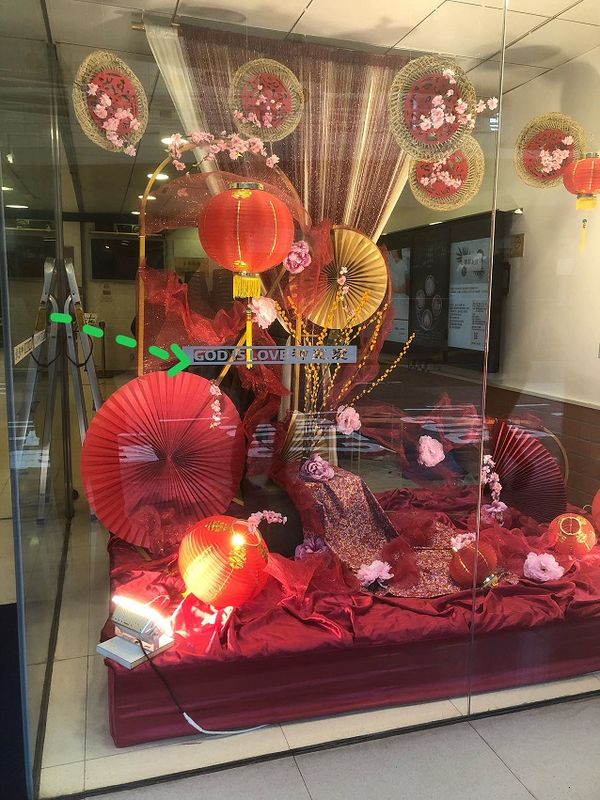 别走眼了,仔细看,不是商场的春节布景,也不会相信是一间教会的櫉窗今年春节布置的画面吧。箭嘴所指的文字「God is love 神是爱」,当看到这字,显然是教会了。