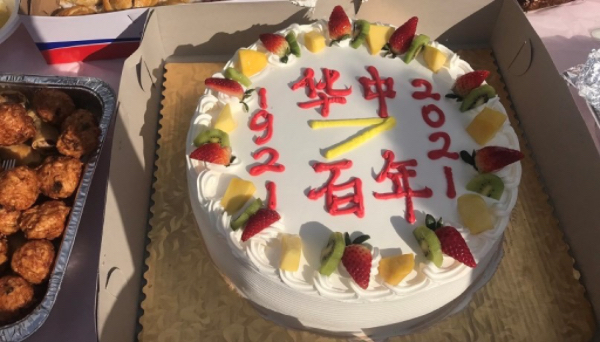 华中钢链班的黄光耀学友平时较少参加聚会,这天他专门定制了一个硕大无比的大蛋糕,上面书有“1921-2021 华中百年”的字体,专门给母校做生日。