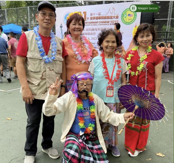 我马上换上缅装;米黄色缅甸民族外套(袋崩因几),红绿皂黑方格纱龙,头绑花巾,鼻孔下贴上乌黑大胡,打开特意从缅甸带来的勃生小花伞,信步走到舞台近旁,立刻引起到场观众的注意,大家好奇又惊讶,似乎滑稽无比的"吴瑞龙"从天而降,坐在观众席上的年轻黑人小伙子,迅速来到我身边,要求与我摄影留念。美国华裔小姐和各队舞蹈演员纷纷跑来与我留影,我也主动与维持会场秩序的华人警察,校友汤琼秀,林冰雯,班友曹婉玲姐妹们留影,有一个老华侨与我留影之余,翘起大拇指夸奖我,你是今天到场观众中打扮得最好的人,了不起,了不起。