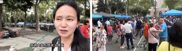 左:媒体采访泼水节活动现场盛况 右:公园里人山人海热闹非凡