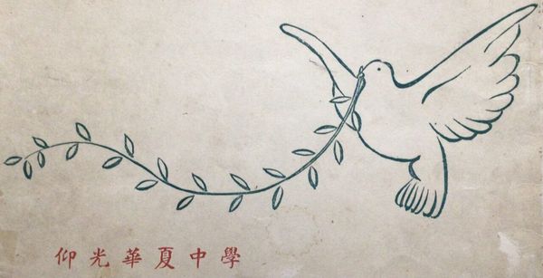 大概是在1952年叶鲁校长曾代表缅华进步人士在国庆节期间到北京去参观並参加国庆大典,其间他为华夏学校订制华夏校章,他回来后代表学校分发给全校所有的同学每人一枚佩在胸前的校服上。校章是铜制的很是美观漂亮。校章是横长方形,横长大约有一寸半(英寸),宽半英寸,校章的正面是红色,在红色面上用金色写上仰光华夏中学的字样。校章四周的边匡也用金色围成一圈。