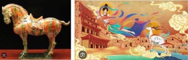左:唐三彩骏马瓷塑,右:唐朝莫高窟飞天彩绘
