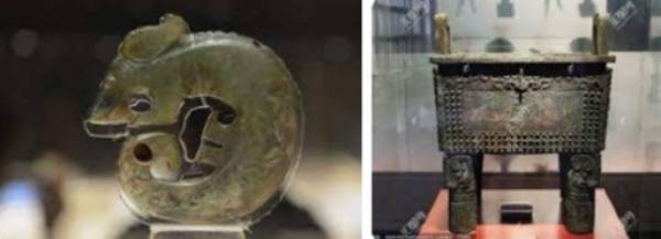 左: 商朝妇好墓出土玉龙,右:商朝妇好墓出土铜鼎
