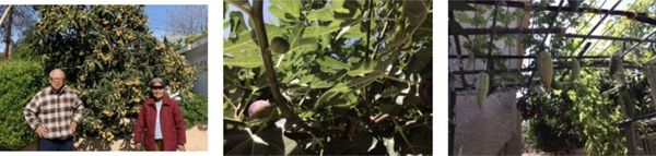 盛夏十分邻居吳太太种的无花果成熟了,几隻身披绿光闪亮的硬壳甲虫飞来饱食,倘若我去驱赶它们,它们立刻飞来报复,毫不留情,十分有趣。红枣也变大变熟了,松鼠不请自来,偷吃红枣。各色蝴蝶在果菜间飞来飞去,吸食花蜜,只是在这里不见蜻蜓,洛杉矶没有臭虫和虱子。