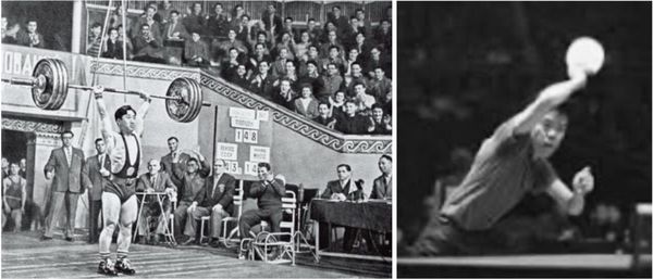 左:中国首位举重世界冠军陈镜开。 右:中国首位乒乓球世界冠军容国团.