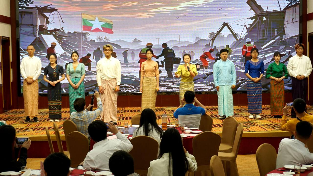 活动开始前,厦门市蓝天救援队、曙光救援队队长为3月28缅甸曼德勒发生7.9级地震,分别从线上送来祝福。厦门各民间救援队的救援队员迅速赶赴缅甸灾区,协助当地开展搜救工作,捐赠救援物资装备,彰显了中缅胞波之间跨越国界的深厚情谊。胡会长说“一场灾难牵动着每一位归侨同胞的心”并提议全体起立,为地震中的死难者默哀一分钟。会场陷入一片寂静,全体人员肃立,向地震遇难者默哀一分钟。华侨大学缅甸留学生带来朗诵《人间有爱,携手共渡》,他们包含深情,深情庄重,用诗歌祈愿缅甸灾区同胞早日战胜灾害、重建家园。