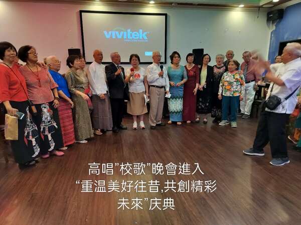 司仪南加朱徐佳, 与北加苏金安,身着华中校服,在简单的开埸白后,由张少应校友指挥,引领全体华友高唱“华中校歌”:大金塔下伊江之滨,生活着我们快乐的一群⋯⋯,激昂的歌声响彻整个会场,在最后两句:我们锻练着坚强的意志,我们学习基本的学问……后,晚会随即进入庆典程序。