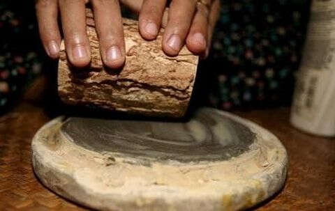 当地几乎家家都有一个像碗那么大小的石磨,这就是用来制做“特纳卡”的。早上起来,洗漱完后,人们先朝小石磨上倒几滴清水,接着把晾干的黄香楝树干置于石磨上面不停地研磨。磨出来的浆汁,就会流入小磨盘边上小槽内。然后,用小刷子把“特纳卡”刷在脸上,有的则是用手直接在两边脸颊上均匀地抹上一片。
