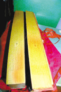 木板的长短标准依据贝叶的大小,对用木板夹齐的贝叶,进行划线的工序,这个工作程序;首先要在贝页上凿两个基座柱洞,座柱洞是为了把贝叶安放在固定贝叶的基座上。座柱洞凿在贝叶两头,左边三份之一,右边三份之一处,所以每张贝叶都有两个柱洞,这柱洞是用烤火的铁丝或铁锥穿凿。
