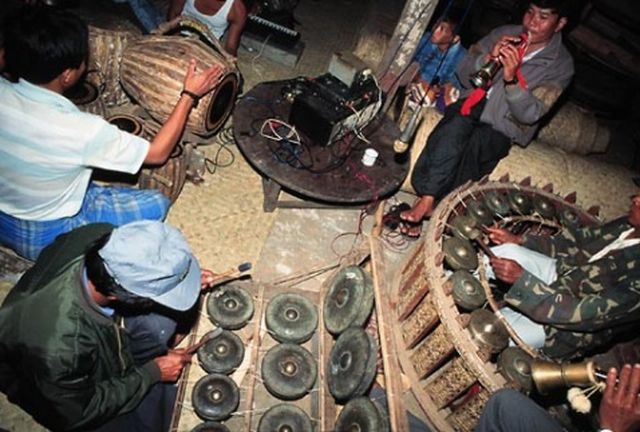千百年来, 缅甸民族乐团, 以圈鼓为中心, 包括其他配鼓, 铜锣圈, 竹片琴, 大小锁呐, 缅式提琴, 铜磬, 大铜锣, 竖笛, 竹掌等十几种乐器, 组成庞大民族乐队, 逢年过节, 喜庆国宴, 室内户外, 独立参演, 深受广大群众喜爱。