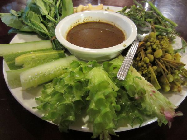 缅族的饭桌魚露和生蔬菜是互配的。贫穷人家没这兩样更是不行。习惯吃魚露的地方一定会有魚露醬。不习惯吃魚露或吃不起魚露的地方,随便能找到的什魚酱和辣椒炒成的菜也是不能免的。和魚露酱相匹配的蘸点蔬菜就是随处可得的本地区产物。蔬菜,有时生吃,有時烤了吃,有時煮熟了吃。另一种吃法是把蔬菜腌成酸菜。手制酸菜虽为众认可,不归蔬菜类的《粉状酸菜》,必须做个交代。那是《酸麻渣》<兰伯亲>。