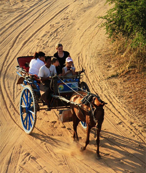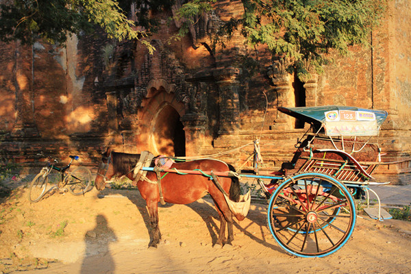 在缅甸重要旅游胜地蒲甘,可以选择徒步、自己骑单车、租马车等多种方式游览。