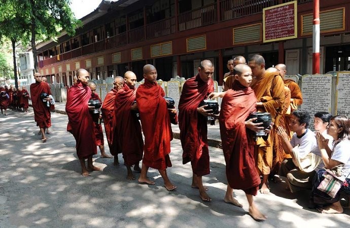 缅甸有“神秘国度”之称,全国5千多万人口中,有80%的人信奉佛教。走在缅甸的街头巷尾,随时随地都可以看到身穿橘红色袈裟的僧侣。据说全国僧侣有40万之多。缅甸的男人虽然生活悠闲,但他们一生必须出家一次,出家次数不限,时间可长可短,有的终身当和尚。更多的则是几年、几个月甚至一两个星期。