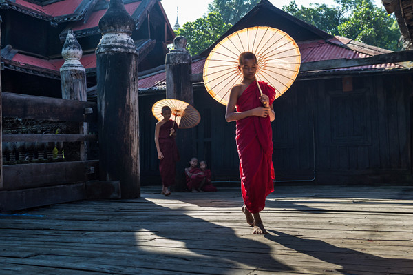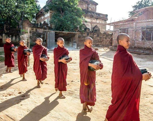 缅甸是一个佛教的国度,信奉佛教的人占全国人口的80%以上,在这里到处都是金色灿烂的佛塔和大大小小的寺院。出家当沙弥是男人成长中必经之路,在寺院里,早晨的街道上,乡村的小路上,车上,舢板上,你都会看到小沙弥光着脚丫出来化缘的。