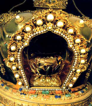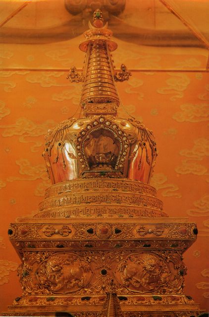 佛牙塔第二层是供奉佛牙舍利之处。佛牙舍利金塔安置在大理石砌成的金刚宝座上。四周环列小金塔八座。佛牙舍利金塔是一件极为精美的国宝,自塔刹、塔身到塔座通体纯金并镶满各种珠宝。塔上文字、图案都具有宗教含义。佛牙舍利供奉在塔内的金莲花座上,金塔四周的八座小金塔代表佛陀的[八相成道]。每座小金塔的塔身玻璃窗内各有一幅佛像。起首为释迦太子降生像,最后为释迦如来涅()像,佛牙舍利塔前的硬木雕刻供桌上是[乾隆五彩]瓷五供及八宝。本层金塔及供品都是上世纪六十年代北京故宫博物馆提供的皇家珍贵文物。