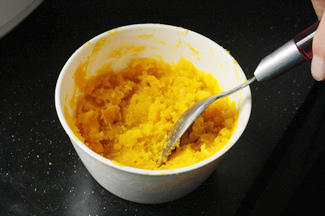 2.将蒸熟的咸蛋黄用小勺碾碎。