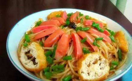 7)再码上火腿肠和油豆腐,撒上葱花。