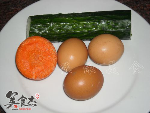 胡萝卜削皮切薄片;黄瓜用盐擦洗干净外表后切成薄片;热油锅,放进胡萝卜片煸炒至软身