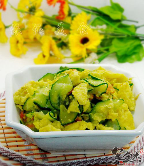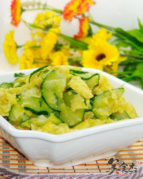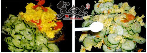 鸡蛋刚凝固就可以加入黄瓜片,翻炒几下