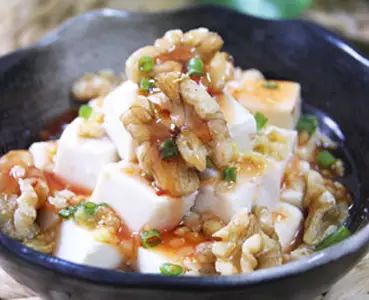 内酯豆腐200克、核桃30克、咸鸭蛋20克、甜辣酱60克、细香葱5克
