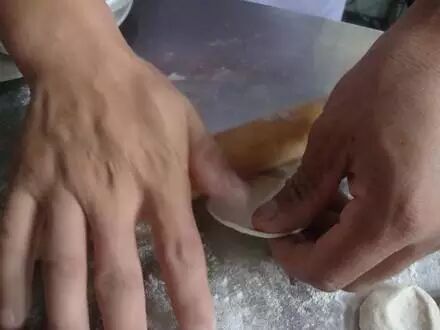 制作方法:面粉加入开水烫成面团,揉光搓条下剂子,擀成圆皮。