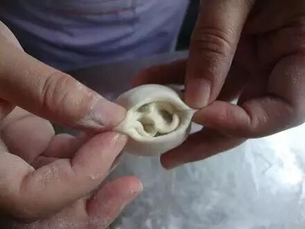 把面团搓条,下剂子擀皮,包入馅心。把圆皮均分5点,粘在一起形成5条边,把口捏紧。