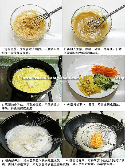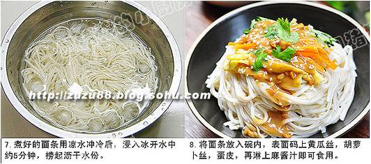 8. 将面条放入碗内,表面码上黄瓜丝,胡萝卜丝,蛋皮,再淋上麻酱汁即可食用。