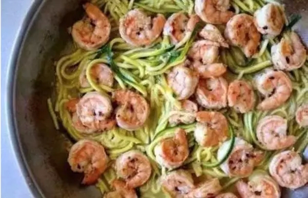 3.鲜虾去壳,煮熟剥好放进意面里,加入刚刚的黄瓜与酱料,搅匀。